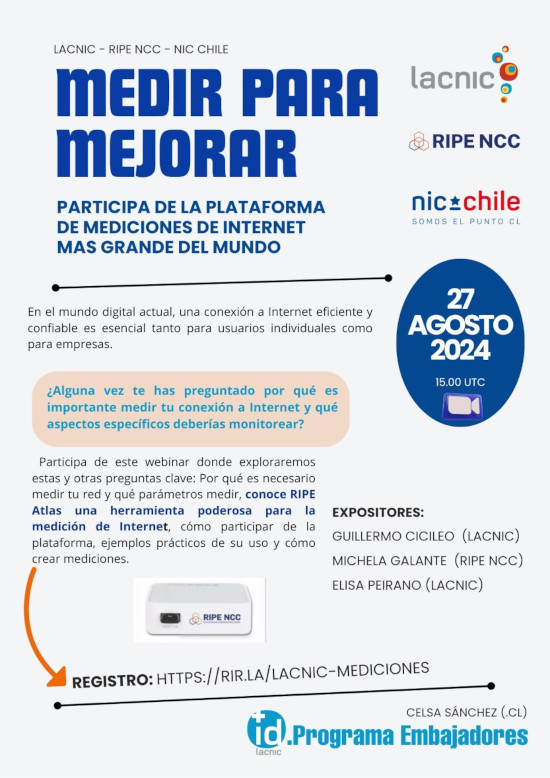 El primer webinar organizado por la ingeniera de NIC Chile Celsa Sánchez es "Medir para mejorar: Participa de la plataforma de mediciones de Internet más grande del mundo", el martes 27 de agosto a las 15.00 horas UTC (11:00 am Chile). Esta conferencia sobre el proyecto RIPE Atlas contará con la participación de Elisa Peirano, Analista de Datos I+D en LACNIC, Michela Galante, Project Coordinator en RIPE NCC y Guillermo Cicileo, Líder de Investigación y Desarrollo en infraestructura de Internet en LACNIC.