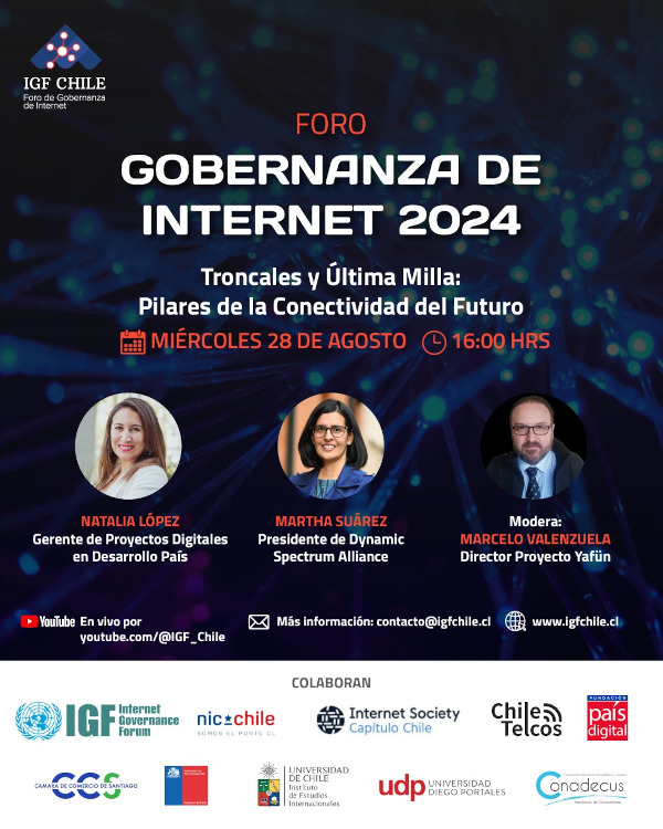 "Troncales y Última Milla: pilares de la conectividad del futuro" es la conversación que sostendrán Natalia López, gerenta de Proyectos Digitales en Desarrollo País, y Martha Suárez, presidenta de la Dynamic Spectrum Alliance, debate que será moderado por Marcelo Valenzuela, director del proyecto Yafün de NIC Chile.