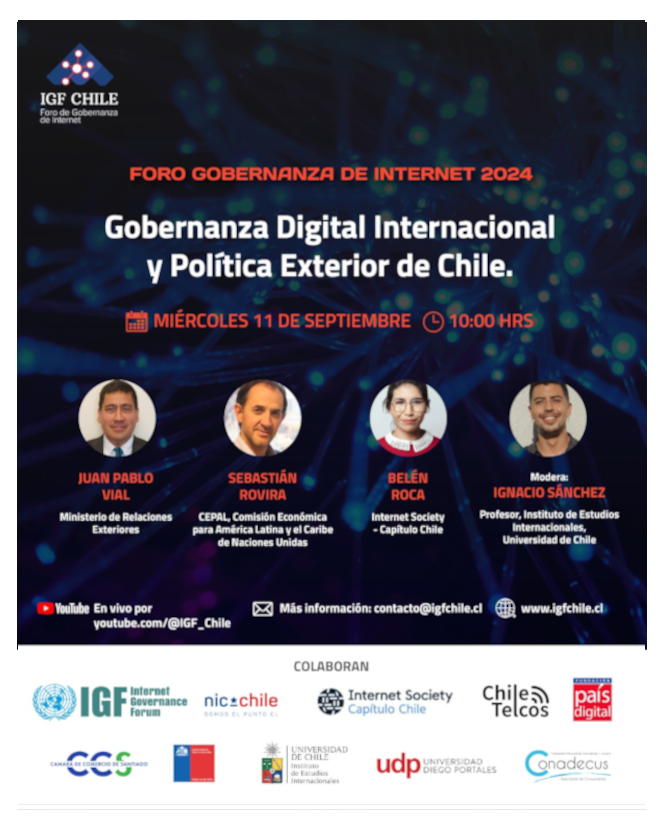Este panel estará moderado por Ignacio Sánchez, académico del Instituto de Estudios Internacionales de la Universidad de Chile, y contará con la participación de Juan Pablo Vial, Encargado de Asuntos Digitales de la División de Ciencias, Energía, Educación, Innovación y Astronomía (DECYTI) del Ministerio de Relaciones Exteriores; Sebastián Rovira, Oficial de Asuntos Económicos de la CEPAL y Belén Roca, Coordinadora de Juventudes del Capítulo Chile de Internet Society.
